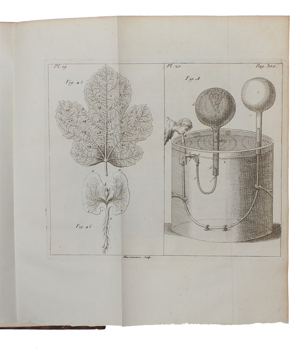 First French edition - "Vegetable Staticks", 1727 - of this milestone work in plant physiology, being the first complete account of the physiology of plants, including the reaction with air and the movement of the sap. Hale's also here introduced a new method of gas collection and the work greatly influenced the subsequent develpment in chemistry and contributed to the discovery of many of the most impirtent medical gases. This importent French translation by Buffon which has the famous "Préface du traductcur," in which Buffon praises the experimental method, and includes Hales’s appendix of 1733, was very influential.