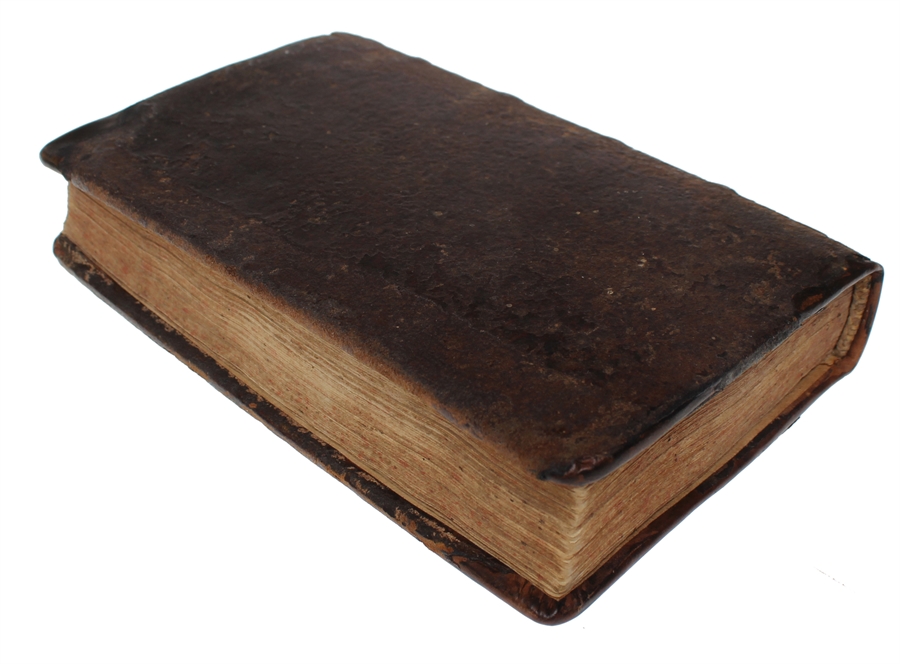 Large 12vo. In contemporary full calf with four raised bands. Extremities with wear. Most of gilt ornamentation to spine worn off and corners with repairs. Lower inner margin of last 50 pp with dampstain. Last 25 pp. with minor loss of paper to upper outer corner, far from affecting text. A good sound copy. (16), 385, (2) pp