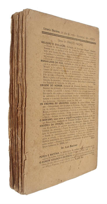 The first edition, in the rarely seen wrappers, of the first Portuguese translation of Darwin's "Origin of Species". The comparatively late translation is partly due to the Portuguese 'Frenchism' at the time. The first French translation appeared in 1862 and was also widely circulated in Portugal. It also appears that the translator, a doctor and professor (who was also a Mason, a self-proclaimed poet, and the founder of the Spiritist Society of Portugal) named Joaquim [Marques] Dá Mesquita [Montenegro] Paúl (1875-1946), used the French translation rather than the English original. This apparently led to a number of errors and mis-translations that rendered the work unfaithful, to say the least. Unfortunately, this translation continued to be reprinted for the rest of the century in the Portuguese speaking world, oftentimes by simply changing the name of the translator for a spurious name.