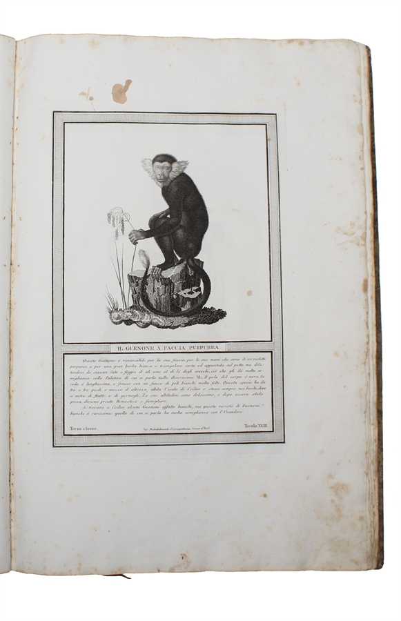 The plates depict apes, monkeys and lemurs from the Old World and The New World in 5 Classes: 1. Genere; Orang; Pithecus. 2. Genere. Babbuino. 3. genere. Guenone; Cercopithecus. 4. Genere. Sapajù; Cebus. 5. genere. Sapajù-Sagoino; Callithrix.- Part II: Famiglia. I Maki; Lemures.