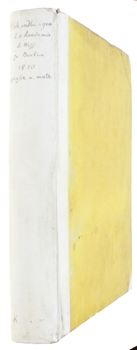 Berlin, 1842. 4to. Entire volume of "Abhandlungen"... and "Mathamatische Abhandlungen"... 1840 present. Contemporary yellow boards with a vellum-like spine. Handwritten title to spine. A bit of wear and soiling to extremities, and corners bent. Internally fine and clean. Stamp to title-page (Dom-Gymnasium Magdeburg, also stamped out). Pp. (187)- 257 + 6 plates, two of which are folded. Text very nice, bright, and clean, plates with a bit of brownspotting. [Entire volume: (6), XVII, (5), 400 pp. + 10 plates, 4 of which are coloured + (4), 137 pp.].