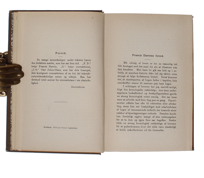 The rare first Norwegian translation of Darwin's "The life and letters of Charles Darwin, including an autobiographical chapter" - being the first translation of any of Darwin's works into Norwegian ("Origin" was translated into Norwegian in 1890).