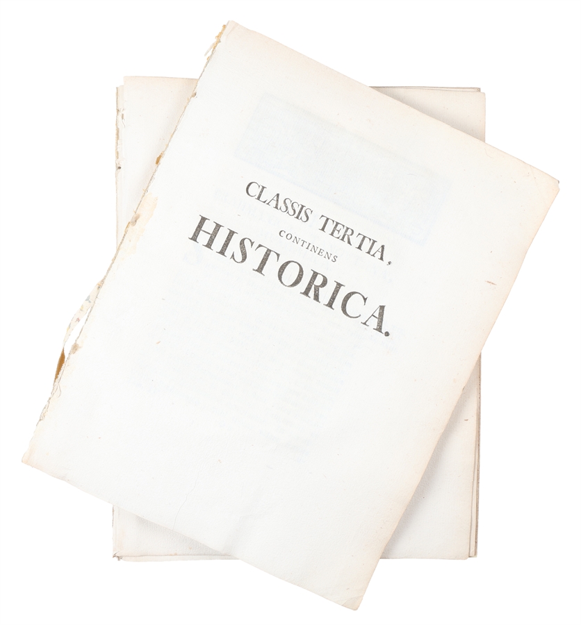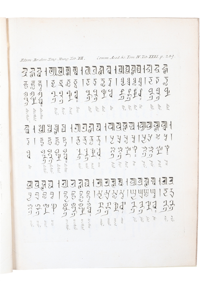 4to. No wrappers. In: "Classes Tertia continens Historica. Commentarii Academiae Scientiarum Imperialis Petropolitanae", Tomus IV ad Annum 1729. The whole section of "Historica"offered. (2) pp. (title to the section),(100)pp. Baye's paper: (23) pp. (wrongly paginated) and 10 engraved plates with numerous, characters, letters etc.