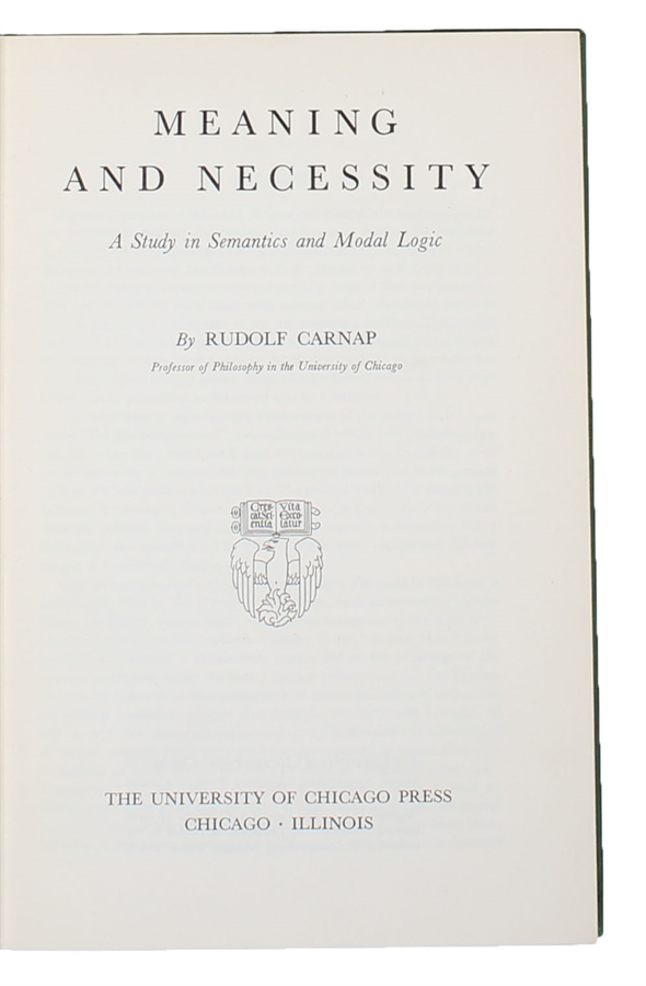 The not common first edition, of Carnap's important main work on semantics, in which he, as the first logician ever, uses semantics to explain modalities. This led to an interest in the structure of scientific theories, and his main concerns here were to describe the distinction between analytic and synthetic statements and to suitably formulate the verifiability principle; -he thus wishes to find a criterion of significance that can be applied to scientific language. THE COPY HAS BELONGED TO THE GREAT LOGICIAN WILLARD ORMAN VAN QUINE and bears his signature to front free end-paper.
