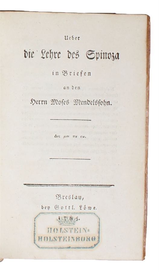 A magnificent presentation-copy of the rare first edition, first issue (with the "S. das Gedicht am Ende des Briefes"-note on p. 11) of this milestone of 18th century thought, one of the most scandalous books of its time, the work that reintroduced Spinoza to a society otherwise dominated by French Enlightenment thinking, and the work that begain the famous "Pantheismusstreit", one of the most important feuds in German philosophy.