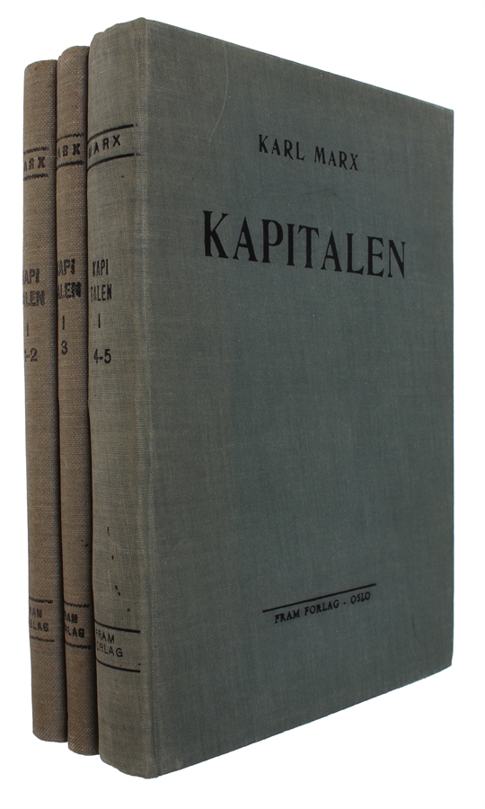 The uncommon first Norwegian translation of Marx’s ‘Das Kapital’ – only volume 1 was ever translated. “Although always small in numbers and often regarded with suspicion by Labour and trade union leaders, the Mot Dag organization was nevertheless an important factor in providing the Norwegian workers’ movement with a cultural policy and attracting artists, writers and intellectuals to the socialist cause. Well-known and respected authors and artists figured prominently in the organisation’s ranks as members and as contributors to the journal of the same name. Mot Dag was also instrumental in establishing cultural and educational enterprises for Norwegian workers within the workers’ movement, most famously the Arbeidernes leksikon (The Workers’ Encyclopaedia), a gigantic and unique collective effort by specialists and writers who worked without remuneration. It set up a successful publishing house where Falk published his Norwegian translation of the first volume of Marx’s Das Kapital (Capital), an undertaking that actually turned out to be profitable. In many ways Mot Dag had a position in Norway comparable to that of The Partisan Review in the United States, as an organisation that, as Hugh Wilford puts it, had a “dual commitment to anti-Stalinist Marxism and cultural Modernism”” (Sørenssen, Olav Dalgard – Politics, Film, Theatre and the Avant-Garde in Norway in the Interwar Years)