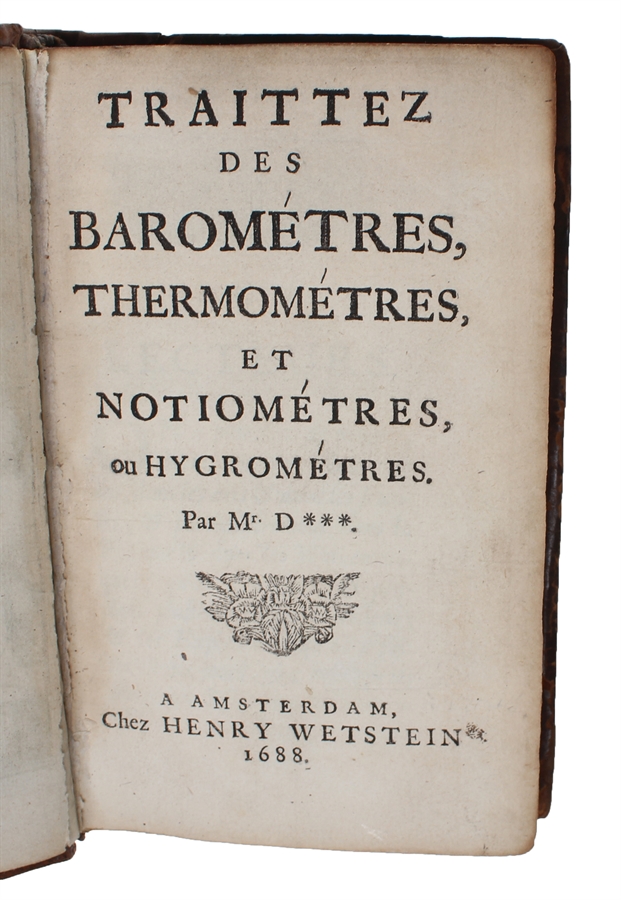 First edition of this beautifully illustrated work, depicting the different instruments in baroque interieurs and in pictorial landscapes, engraved by A. Schoonebeck. - "The earliest account dealing exclusively with the subject, and especially valuable as the first work laying down rules for the graduation of the thermometer." (Sotheran No. 929, note). - "His detailed description of the principal meteorological instruments of the period is enriched with several new ideas, such as the calibration of the thermometric scale on the basis of two points of change of state: the point at which water freezes and - a much more contestable point - that at which butter melts." (DSB). - Unknown to Poggendorff. - Wellcome II: p. 28.