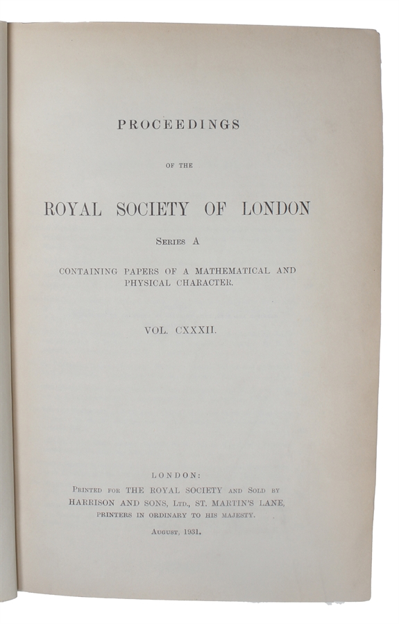London, Harrison and Sons, 1931. Royal8vo. Bound in contemporary full blue cloth with gilt lettering to spine. In "Proceedings of the Royal Society", Series A, Vol. 132 & 133, 1933. A very fine and clean copy. [Dirac in Vol 133:] Pp. 61-72. [Entire volume: V(1), 703-706, 701, (1), XIV, 695, IX pp.]