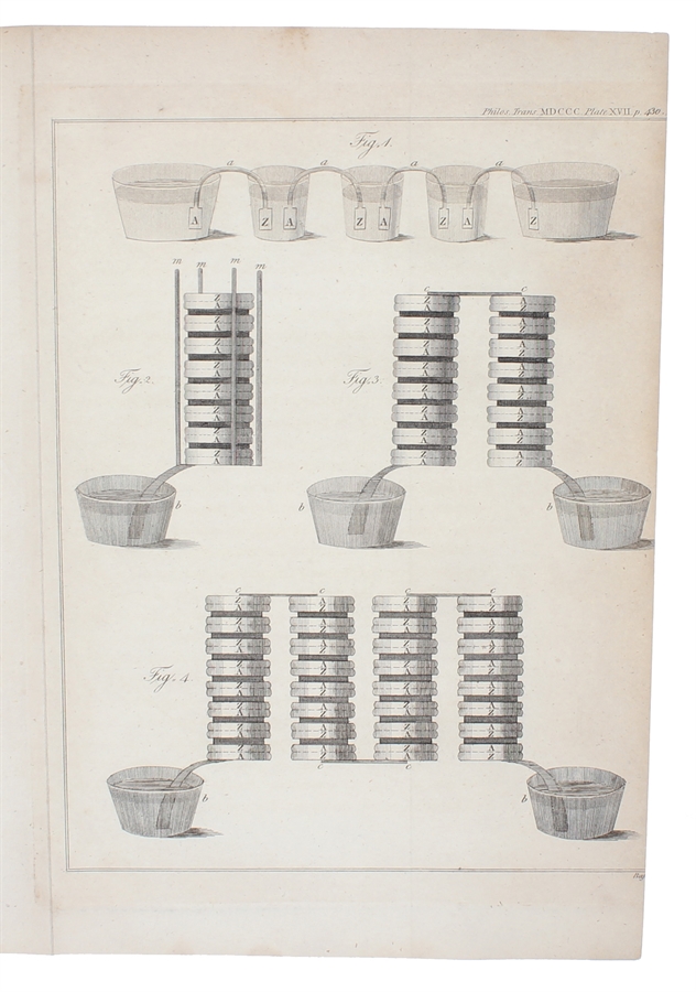 First edition of "the first announcement of the voltaic 'pile,' or electric battery" (Grolier/Horblit). It was a breakthrough in physics, and led to the development of electrotechnology and is today regarded as being one of the major milestones in the history of science.