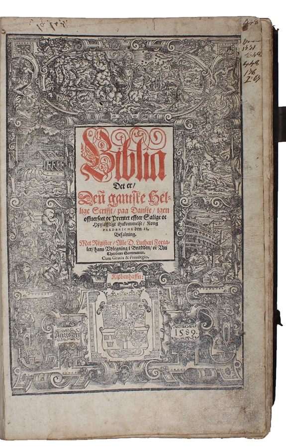 The magnificent first printing of the second Danish-Norwegian Bible in folio. This, the second Danish Bible in folio, is also the first to be printed by a Dane. The scarce and famous "Frederik II-Bible" constitutes the magnum opus of the famed book printer Mads Vingaard "and the most extensive work of printing undertaken in Denmark during the sixteenth century. The book is profusely illustrated with woodcuts copied from a german Bible issued by Sigmund Feyerabend in Frankfurt a. M. 1560. The original woodcuts were made by the artist and craftsman Virgil Solis... Wide woodcut borders together with pictures using themes from the Scriptures surround the title pages and the illustrations. On the reverse of the first title page many copies have pasted in a portrait of Frederich II, engraved by the Dutch artist Hendrick Goltzius. However, this portrait may also be found on a separate leaf." (Thesaurus I).