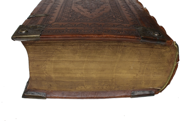 Folio (binding: 37 x 25 cm.). Bound in a spledid, contemporary full calf binding over wooden boards. Rich, elaborate gilding to both boards and spine. The gilding is vague, especially on the front board, but the tooling is very sharp, and the binding overall is magnificent. With four beautiful, ornamented brass edges to each board and two large ornamented brass clasps. All edges are gilt and beautifully blindtooled.