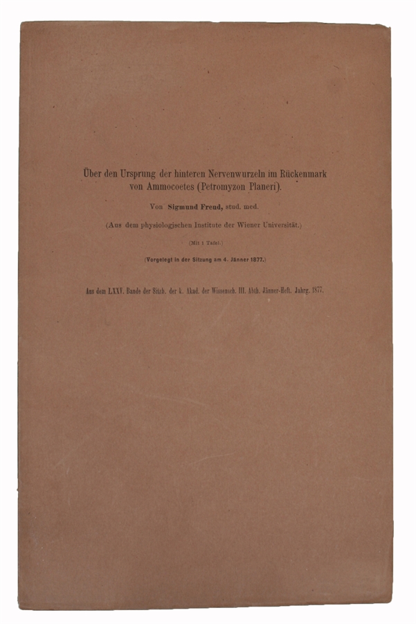 "To this vast and exciting field of research [the composition of nerve cells and the question whether the nervous system of higher animals is made up of elements different from those of lower animals] belonged the very modest problem which Brücke put before Freud. In the spinal cord of the Amoecetes (Petromyzon), a genus of fish belonging to the primitive Cyclostomatae, Reissner had discovered a particular kind of cell. ... Brücke wished the histology of these cells clarified. After a few weeks Freud came to him with the quite unexpected discovery that non-myelinated fibres of the posterior (sensory) nerves originated in some of Reissner's cells. Other fibres, probably also sensory, coming from these cells passed behind the central canal to the opposite side of the spinal cord ... Brücke pressed for publication [and] presented the study at the Academy of Sciences meeting of january 4, 1877. It appeared in the January Bulletin of the Academy. It was the first paper of Freud's to be actually published, since the one on his first piece of research, on the eel, did not appear until 3 months later." (Jones, Life and Work, vol. I, pp. 51 - 53).