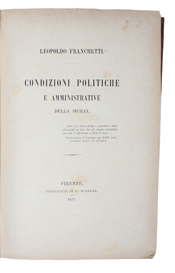 "The situation in Sicily was at the centre of the political struggle: it was an electoral stronghold for the left, a scene for both great social tensions and an acute outbreak of crime. The was the context that Franchetti and Sonnino found when they went to Sicily to carry out their private enquiry, unfettered by the needs and relationships which could have conditioned the official enquiry. They visited the island in the first half of 1876 and then wrote the two volumes of the enquiry separately (Franchetti wrote about the political and administrative conditions, Sonnino about the peasants). In particular, Franchetti's volume gave rise to two crucial questions which marked (and, in part, still do) civil debates in contemporary Italy: The Southern questions and the issue of the mafia." (Coluccello, Challenging the Mafia Mystique: Cosa Nostra from Legitimisation to Denunciation).