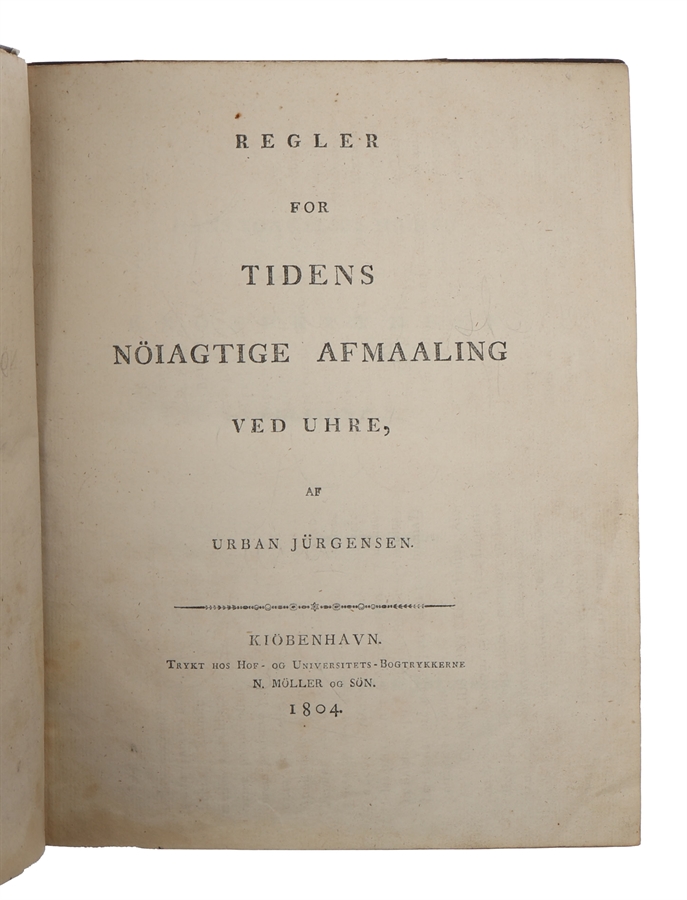 Exceedingly scarce first edition of the first Danish book on watchmaking, constituting a magnum opus of modern watchmaking. After having trained abroad, in Le Locle, Paris, and London, Urban Jürgensen was one of the best-trained watchmakers in the world by the time he returned to Copenhagen in 1801. Not only did he master to perfection the finest techniques of the age, he also improved upon them and experimented with various technologies. His great treatise from 1804, Rules for the Accurate Measurement of Time by Watches and Clocks, is arguably the most important treatise on watchmaking from this period; it was used as a manual for watchmakers all over Europe and is still in use today. The first edition is of the utmost scarcity, with very few copies known on private hands and only a handful of copies in libraries worldwide. The work was quickly translated into French, and a second edition of the Danish translation appeared in 1839. “The story starts with Jørgen Jürgensen, an early Danish watchmaker, in 1773. To give a sense of what Danish watchmaking looked like in the late 1700s, around 20 craftsmen were registered to the trade in Copenhagen. Before Jørgen received Royal support for his business in 1781, the majority of watches in Denmark were imported and of low quality. He successfully made the case over many years that with the government's support, he could create a true domestic industry. As a result, Jørgen can be described as the father of Danish watchmaking. He trained apprentices and was given the right to run a manufacturer. This right was even extended to his sons... "if they possessed the necessary competence for the task." Jørgen's eldest son, Urban Jürgensen, proved to possess more than the necessary competence. Born in 1776, Urban was incredibly intelligent, leaving Copenhagen at the age of 21 after Jørgen decided he had learned all that he could in his home country. His travels brought him to Le Locle, studying under Jacques-Frédéric Houriet; to Paris, to learn from Abraham-Louis Breguet and Ferdinand Berthoud; and then to London, apprenticing for John Arnold and John Brockbank. Urban Jürgensen was one of the best-trained watchmakers in the world by the time he returned to Copenhagen in 1801 – and he backed it up. Before his death in 1830, he produced over 700 watches, including 45 marine chronometers. Urban experimented with various escapement technologies he had encountered during his travels, working with various ébauches, but he certainly preferred the chronometer or detent escapement. He even improved upon the work of Thomas Earnshaw and John Arnold in England by developing the detached double-wheel chronometer escapement toward the end of his career. Jørgen established the idea of Danish watchmaking, and Urban ran with it – particularly with an eye for scientific precision and accuracy.” (https://www.hodinkee.com/articles/urban-jurgensen-then-and-now). “In 1773, Danish horologist Jürgen Jürgensen presented his masterpiece, a repeating watch, to the Danish Watchmakers Guild in Copenhagen, Denmark. The culmination of six years of training in Germany and Switzerland, his efforts earned him the title of Master Watchmaker. Three years later, his eldest son Urban was born. Urban’s star would eclipse even that of his talented father, sparking a multigenerational saga that continues to this day. … Urban, born in 1776, set out on an apprenticeship journey — much as his father had before him — at the age of 21. Having already studied horology under his father’s tutelage, he made his way to France and England, where he had the tremendous fortune of studying in the workshops of Abraham-Louis Breguet, Ferdinand Berthoud and John Arnold. Due to his Danish citizenship, Jürgensen was able to navigate the geopolitical waters that would otherwise have stifled the ambition of an Englishman or a Frenchman desiring to work with his fellows across the Channel. (The two countries were archrivals and soon to be engaged in the Napoleonic Wars.). Returning to Copenhagen in 1801, Urban got to work designing marine chronometers, astronomical pendulum clocks, and even a bi-metallic pocket thermometer that functioned better than standard mercury-based models in freezing temperatures. His 1804 treatise Rules for the Accurate Measurement of Time by Watches and Clocks — published at the age of 28 — was the first Danish book on watchmaking and is still in use today. The influence of Breguet, Arnold and Berthoud combined with his Danish sense of design in functional, forward-thinking, beautiful timepieces began to impress in the highest circles: In quick succession, Jürgensen became the official supplier of marine chronometers to the Royal Danish Navy; the first tradesman inducted into the Royal Danish Academy of Sciences; and, in 1824, a Knight of the Order of the Dannebrog.” (https://www.insidehook.com/watches/urban-jurgensen-historical-watchmaker-returns) “Urban Jürgensen is an independent high-end brand known for obsessing over details, creating masterpieces that may appear minimalistic, but hide an execution of subtleties that few ateliers can match. Founded in Copenhagen in 1773 by Jürgen Jürgensen, the company is among the foremost watchmaking dynasties in history. During the 18th and 19th centuries, the Jürgensen family worked with legends like Jacques-Frédéric Houriet, Abraham-Louis Breguet and John Arnold to set standards for fine watchmaking that still apply today. Urban Jürgensen, first son of Jürgen, continued building the family's brand with innovations like a cylinder escape wheel comprised of hardened steel (instead of traditional brass) to greatly reduce wear and increase reliability. His book, Principes Généraux de l'Exacte Mesure du temps par les Horloges [i.e. the present book, French translation], is still a relevant reference for today's watchmakers. Headquartered in Biel/Bienne, Switzerland, the company was for a time und