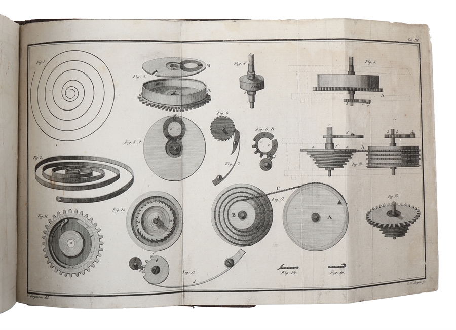 4to. Near contemporary brown half calf with cloth-covered boards gilt title to spine (UREMAKER KUNST), with Australian bookbinder's etiquette: "W. Detmold, Melbourne" to inside of front board. Pencil name and doodles to front end-papers and traces of the same kind of pencil-names and doodling to the first leaves, removed. Front free end-paper with a portrait inserted (possibly of Urban Jürgensen, possibly of his brother Jøregen Jørgensen - see below under Provenance). Hinges and capitals worn. Hinges professionally re-enforced from verso and restorations to capitals. Text overall nice and clean, with the occasinal browning or dampstaining. Plates have some overall toning/even soiling and staining and some occasional offsetting or spotting. They have been lightly, and very professionally, cleaned, and a few of them have edge restorations (far from affecting image) or a small re-enfircement from verso, barely noticeable. Bothe text and plates printed on thick, heavy paper. XXVI,242 pp. and 18 double-page folded engraved plates.