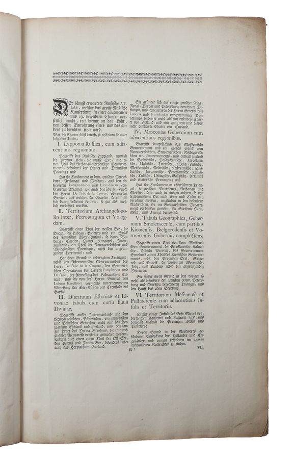 “Compiled under the direction of Joseph Nicolas Delisle, who was called to St. Peterburg in 1726 to take charge of the work. In 1740, in order to hasten the completion of the atlas, he was assisted by several scientists, including his brother Louis. The atlas was finished in 1745 and published in same year by the academy of sciences of St. Petersburg.” (Phillips)