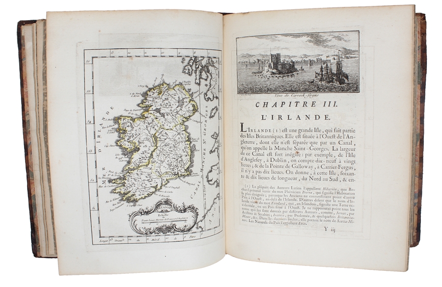 Paris, Didot, 1757. 4to. Contemp. full mottled calf. Raised bands. Richly gilt compartments. Titlelabel with gilt lettering. Triple gilt line-boders on covers. Spineends with small repairs. Corners restored. Marbled edges. On both covers a large gilt royal coat of arms (Louis XV ?). Stamp on title-page. Engraved title-page (and printed). (6),471 pp., 4 engraved handcoloured maps (of 5) and 35 fine engraved townviews and plans in the text. A few small scattered brownspots. printed on good paper, internally fine.