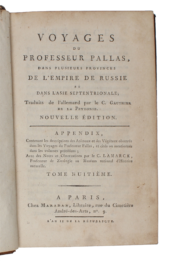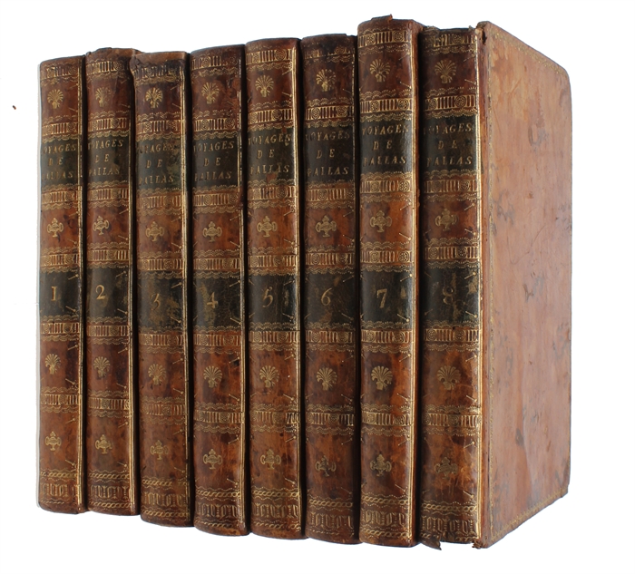 8vo. Bound in 8 uniform contemp. full mottled calf. Richly gilt spines. Tome-and titlelabels with gilt lettering on spines. A few spine-ends with light wear. Stamps on half-titles. Without Atlas-volume.