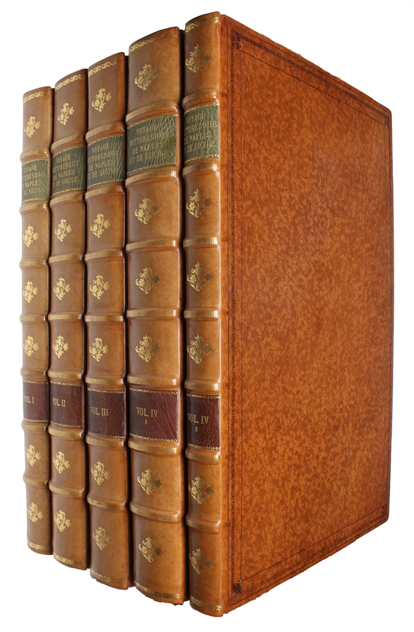 In 1759, Claude Richard Saint-Non (1727-1791) was relieved of his duties as a deacon and lawyer, and undertook a cavalier tour through Italy in the years 1759-1761 with the painters Jean-Honoré Fragonard and Hubert Robert. His publication project of a Voyage pittoresque initially envisaged five volumes on the whole of Italy and a volume on Switzerland, but then limited itself to only southern Italy. For the etchings Saint-Non on the one hand on some older pictures by Robert and Fragonard among others. On the other hand, the 61 employed engravers worked mainly on documents which had been supplied by a group of artists traveling on his behalf under the direction of Dominique Vivant Denon, secretary of the French Ambassador in Italy, in 1777/78. Volume I deals with the history, buildings, artists and customs of Naples and Vesuvius with its outbursts. Volume II is dedicated to Herculaneum and Pompeii; Volume III deals with Southern Italy (including Paestum and Capri). Sicily is treated in volumes IV and V.