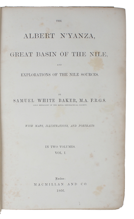 First edition of Baker's famous account of his discovery of the last great source of the Nile, Speke and Grant having established Lake Victoria Nyanza as the source of the White Nile and Bruce discovering the source of the Blue. The present work constitute one of the great travel narratives on African exploration. “First published in two illustrated volumes in 1866, this account of his most celebrated expedition is amongst the most important works of its type. Baker promises 'to take the reader by the hand, and lead him step by step … through scorching deserts and thirsty sands; through swamp and jungle … until I bring him, faint with the wearying journey, to that high cliff … from which he shall look down upon the vast Albert Lake and drink with me from the sources of the Nile!' Volume 2 finds Baker a prisoner of a native king. Baker offers a number of 'gifts' to buy his release, and after an arduous journey, with his wife in a coma, in March 1864 he reaches Luta N'zige, which he renames in memory of Prince Albert. A compelling account of an historic adventure.” (Editor’s note to the facsimile reprint published by Cambridge University Press (2011)) Czech (Africa) p.10