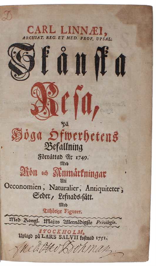 First edition, second issue, here in an interesting interim state with “Gödselen” on p. 26 (indicating the second issue) but with p. 25 misspelled as “52” not called for in neither first nor second issue. “Linnaeus’ research work during his mature years began with trips to various Swedish provinces. By order of the parliament, which wanted an inventory of all the natural resources of the country, during three summers in the 1740’s Linnaeus traveled through selected areas to describe them and to search for dyestuffs, minerals, clay, and other economically useful substances. His reports of these expeditions were published as Ölandska och gothländska resa (1745), Västgöta resa (1747), and Skånska resa (1751), all written in Swedish. Nothing escaped his attention on his travels on horseback—plants and insects, runic stones and other ancient remnants, farmers working in the fields and meadows, the changes in the weather. His prose style was simple and strong, sometimes rising to lyrical outbursts or spiced with effective similes.” (DSB) Hulth P. 81.