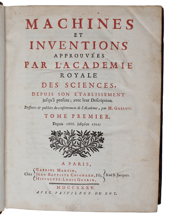 First edition of this important and extensive work containing both descriptions and engravings of all the inventions approved from the beginning of the French “l'Academie Royale des Sciences” in 1666. “Thus, it documents the increasing interest in technology during this period in France. The devices are simply described in chronolopgical order. They cover all the areas then known in arts, sciences, engineering and manufacturing” (Erwin Tomash). It constitute one of the most important historical sources for the study of the manufactures of the late 17th and early 18th century. The inventors included Godin and Outhier - who were involved in the expedition to measure the arc of the meridian with their instruments -, Dortous de Mairan, Cassini, Clairaut le père, l'abbé Nollet, Huygens, Perrault, Gauger, Le Maire, De La Hire, Morland,and in particular the arithmetic machines of Pascal (vol.4, plates 262-263), Lépine (vol.4, plates 259-261), and Hillerin de Boistissandeau (vol.5, plates 341-343). Gallon (1706-75), a French engineer, was commissioned by the Academy to edit the descriptions made of the machinery that they approved. The Academy added another volume forty-two years later (1777), after Gallon's death.