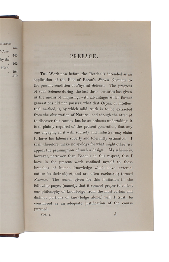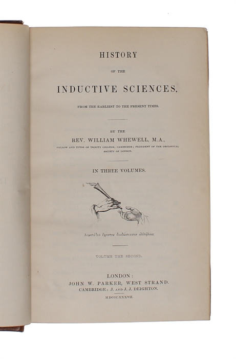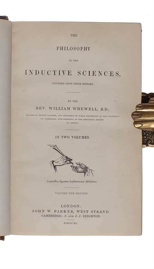 Uncommon first editions of both these splendid works (the "Philosophy" is particularly scarce), Whewell's two main works, both seminal in the history of science and philosophy of science. The first of the two works, the "History" is considered "one of the important surveys of science from the Greeks to the nineteenth century" (DSB), and it is in the second of them, "The Philosophy..." - "one of the masterpieces of Victorian philosophy of science" (DSB) - that he coins the word "scientist", to describe a cultivator of science in general. “William Whewell (1794–1866) was one of the most important and influential figures in nineteenth-century Britain. Whewell, a polymath, wrote extensively on numerous subjects, including mechanics, mineralogy, geology, astronomy, political economy, theology, educational reform, international law, and architecture, as well as the works that remain the most well-known today in philosophy of science, history of science, and moral philosophy. He was one of the founding members and a president of the British Association for the Advancement of Science, a fellow of the Royal Society, president of the Geological Society, and longtime Master of Trinity College, Cambridge. In his own time his influence was acknowledged by the major scientists of the day, such as John Herschel, Charles Darwin, Charles Lyell and Michael Faraday, who frequently turned to Whewell for philosophical and scientific advice, and, interestingly, for terminological assistance. Whewell invented the terms “anode,” “cathode,” and “ion” for Faraday. In response to a challenge by the poet S.T. Coleridge in 1833, Whewell invented the English word “scientist;” before this time the only terms in use in that language were “natural philosopher” and “man of science”.” (SEP). "First published in 1840, this two-volume treatise by Cambridge polymath William Whewell (1794-1886) remains significant in the philosophy of science. The work was intended as the 'moral' to his three-volume History of the Inductive Sciences (1837)... Building on philosophical foundations laid by Immanuel Kant and Francis Bacon, Whewell opens with the aphorism 'Man is the Interpreter of Nature, Science the right interpretation'. Volume 1 contains the majority of Whewell's section on 'ideas', in which he investigates the philosophy underlying a range of different disciplines, including pure, classificatory and mechanical sciences. Whewell's work upholds throughout his belief that the mind was active and not merely a passive receiver of knowledge from the world. A key text in Victorian epistemological debates, notably challenged by John Stuart Mill and his System of Logic, Whewell's treatise merits continued study and discussion in the present day." (Cambridge University Press). "From the late 1830's until his death, Whewell worked mainly in the history and philosophy of science. His three-volume "History of the Inductive Sciences" appeared in 1837; in 1838 he was appointed professor of moral philosophy; and the first edition of his two-volume "The Philosophy of the Inductive Sciences, Founded Upon Their History" was published in 1840. Both the "History" and the "Philosophy" were ambitious works, and together they constitute Whewell's major scholarly achievement. The "History" had no rivals in its day and remains, despite unevenness, one of the important surveys of science from the Greeks to the nineteenth century. Whewell appreciated the importance of Greek science, especially astronomy, but showed typical disregard for the contributions of medieval scientists. His assessment of the importance of contributions of such major figures as Galileo and Descartes suffers from a heavy intrusion of religious and philosophical biases. But his treatment of Newton and other modern mathematical scientists is fair and sometime brilliant, and is based throughout upon detailed considerations of texts. Wheweel's "Philosophy" stimulated major philosophical exchanges between its author and Sir John Herschel, Augustus De Morgan, Henry L. Mansel, and John Stuart Mill. Alongside Mill's "System of Logic" and Herschel's "Preliminary Discourse on the Study of Natural Philosophy", the work ranks as one of the masterpieces of Victorian philosophy of science. Whewell's effort in these works was unique in his attempt to derive a philosophy of science from the general features of the historical development of empirical science. The importance of this attempt has not been fully appreciated. Whewell thought that the history of science displayed a progressive movement from less to more general theories, from imperfectly understood facts to basic sciences built upon a priori foundations that he called "Fundamental Ideas." All science was theoretical in that no body of data comes to us selforganized; even collection of data involves the imposition of a guiding interpretive idea. Major advances in science occur in what Whewell called an "Inductive Epoch," a period in which the basic ideas of a science are well understood by one or more scientists, and in which the generality and explanatory power of a science are seen to be much more illuminating than those of rival theories. Each such "Epoch" had a "Prelude," a period in which older theories experienced difficulties and new ideas were seen to be required, and a "Sequel," a period in which the new theory was applied and refined. Largely ignoring the British tradition of empiricist philosophy and methodology, Whewell erected a philosophy of science upon his understanding of history that derived partly from Kant and Plato, and partly from an anachronistic theological position. Like his British predecessors, he thought that induction was the basic method of science. He understood induction not as a form of inference from particulars to generalizations, but as a conceptual act of coming to see that a group of data can best be understood and organized (his term was "colligated") under a certain i