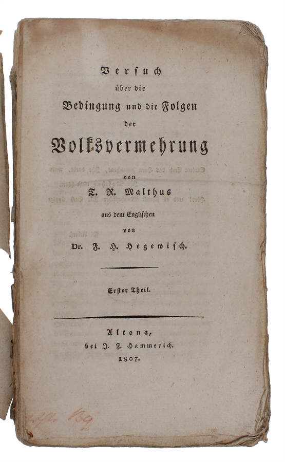 Rare first German edition of this political and economic classic, which constitutes Malthus' first major publication and his main work, because of which he is considered the father of demography and one of the main sources of inspiration for Darwin and Wallace. It is the first translation of the "Principle on Population" into any language, and it influenced German politics tremendously.
