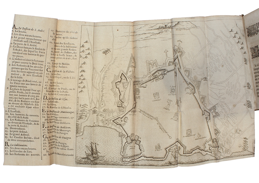 The uncommon first edition of this famous account of the expedition undertaken by François d'Aubusson, duc de la Feuillade to assist the Venetian rulers of Heraklion, Crete (Candia), against the siege undertaken by Ottomans in the final year of the Cretan Wars (1645-1669) De la Feuillade, who had previously engaged Ottoman forces at the Battle of St. Gothard in 1664, willingly volunteered for this mission. With support from Pope Clement IX, he personally funded and organized a contingent of 500 men. The journal, composed as a letter by a volunteer on the expedition, not only provides a detailed account of the Cretan war but also offers valuable insights into the Greek Orthodox Church. Interestingly, the manuscript fell into the possession of a certain Thioly, who, despite having the text, disavowed any knowledge of the author. Subsequently two more editions were published in Grenoble in the same year, followed by another in 1670. Additionally, an English translation was published in 1670.