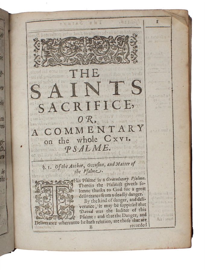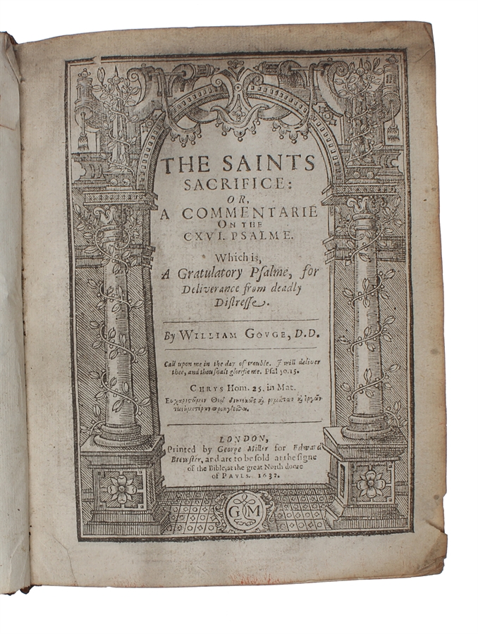 The uncommon first edition of Gouge's commentary on psalm 116 which in protestant Christianity often is referred to as the thanksgiving psalm. Pastor William Gouge (1575–1653) was an English clergyman and theologian known for his work during the Jacobean and Caroline eras. He was a prominent Puritan and a strong advocate for the Presbyterian form of church government. Gouge played a significant role in the development of Puritan theology and was actively involved in the religious and political debates of his time. Gouge's writings cover a range of topics, including theology, family life, and church government.