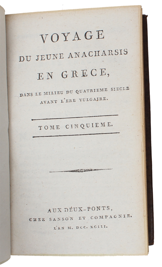 Later edition of the fictional voyage the young Anacharsis travels in Greece. (Brunet I, 674 - not listing the present edition).