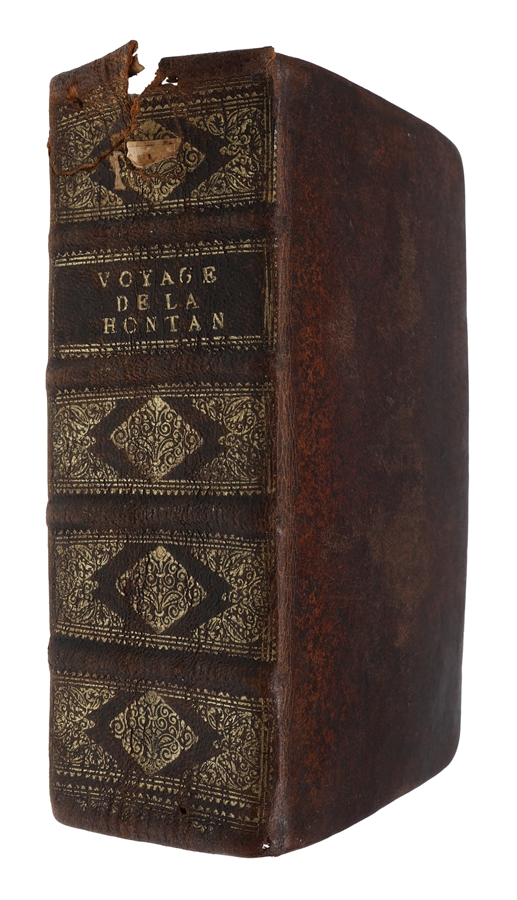8vo. In contemporary full calf with four raised bands and richly gilt spine. Tear to upper part of spine. Bookblock bended but still firmly attached to the binding. Title-page and frontispiece (of 'Voyages Du Baron Lahontan') with tears and chipped in margin, partly detached. With a few occassional brownspots and tears in plates.