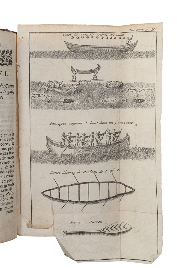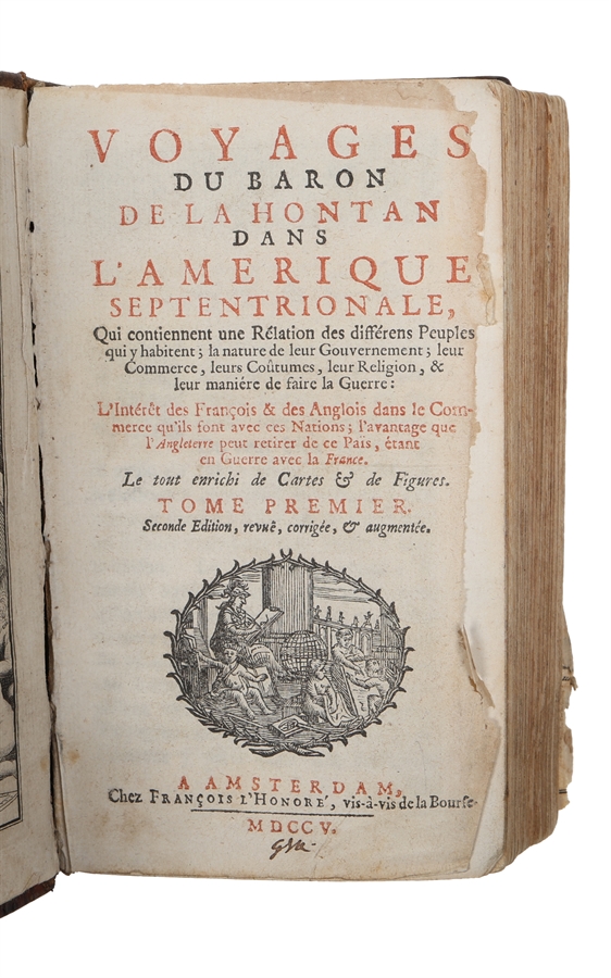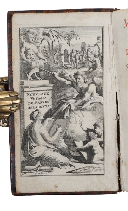 Second Edition, revised and enlarged, of Lahontan’s most famous work being a mix of travel narrative, geographical and ethnographic description and philosophical reflection, providing an account of Lahontan's experiences in New France and the broader North American continent, both containing personal experiences and fictionalized accounts "Although much of the work has been condemned as over-imaginative, it did influence the subsequent growth of primitivism in France and England, as reflected in the works of Montesquieu, Voltaire, Jonathan Swift, and others. For example, he tells of a tribe which he calls Essanapes, who worshiped the sun, the moon, and the stars. Beyond the Essanapes lived the Gnascitares, who lived on the shore of a great lake, and upon this lake were canoes rowed by 200 oarsmen. They had buildings three storeys high and fought battles with the Spaniards in New Mexico. The great king of this country lived in a royal palace waited upon by hundreds of servants. To add weight to this account Lahontan actually drew a map of the region, now located within the boundaries of Nebraska and South Dakota" (Howgego V1-L-54). Louis Armand de Lom d’Arce, Baron de Lahontan (1666–1715), also known as Baron de Lahontan, was a French soldier, explorer and writer. He is best known for his travels in North America and his influential writings, which provide insights into the geography, indigenous cultures and politics of the region during the late 17th and early 18th centuries. Sabin 38641 & 38634