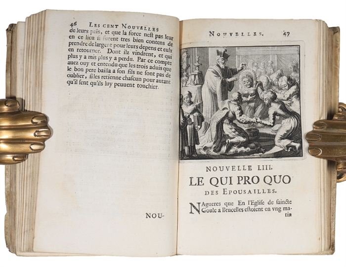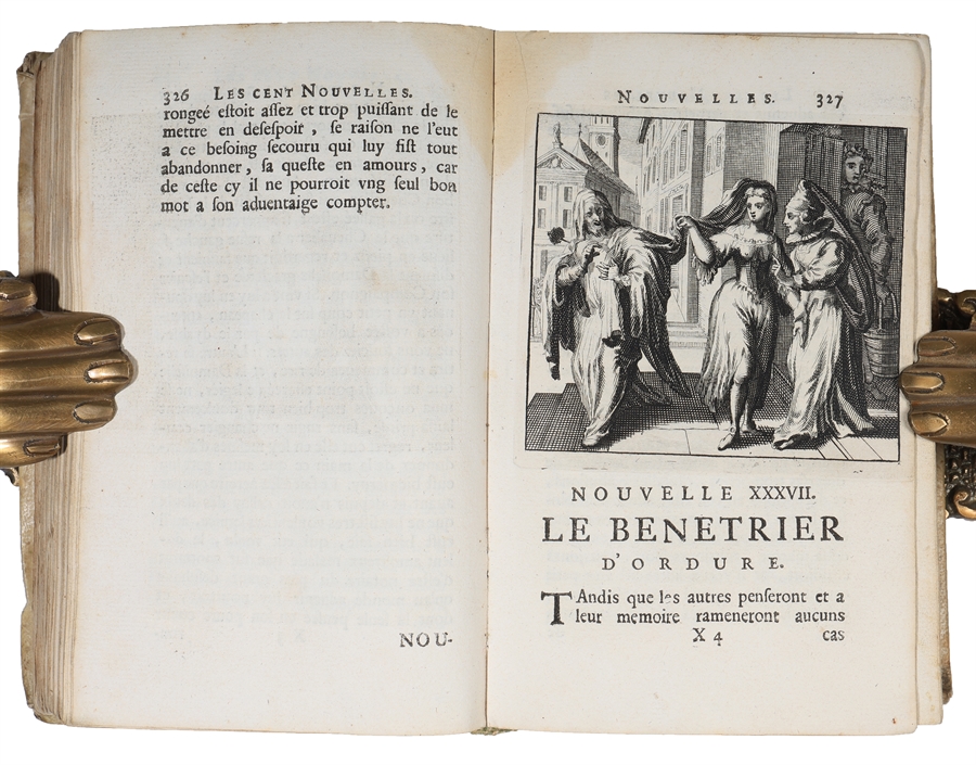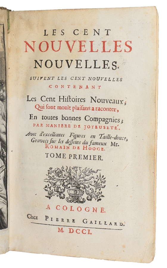 First edition with Hooghe’s beautiful illustrations of this famous collection of tales modelled on Boccaccio’s Decameron. According to Brunet, two variants were published: one with text published below or above the engraving (The present copy) and one with engravings published separately. According to Brunet the former is preferable due to better printing quality. (Brunet I, 1735/1736). "Les Cent Nouvelles Nouvelles" stands as a cornerstone in the development of French literature and is regarded as being the first work of literary prose in French. Believed to have been composed around the 1460s at the court of Duke Philip the Good of Burgundy, this collection of tales offers a glimpse into the cultural and literary landscape of late Medieval France. The stories were collected and possibly edited by Antoine de la Sale (1385/86 – 1460/61). "Les Cent Nouvelles Nouvelles" were first printed by Antoine Vérard in 1486, twenty years after manuscript circulation (only one manuscript is known today). Romeyn de Hooghe (1645 - 1708), born in Amsterdam, was a multi-talented artist known for etching, drawing, painting, and sculpting. He became famous for his political caricatures of Louis XIV and propaganda prints supporting William of Orange. His work included early comic strips and illustrations for significant texts like "Hieroglyphica of Merkbeelden der oude volkeren" (1735). Historian Simon Schama lauded de Hooghe as the first great modern graphic satirist, highlighting his role in portraying conflicts between William III and Louis XIV as struggles for liberty against religious despotism. Brunet, II, 1735.