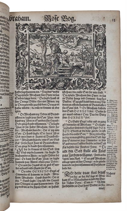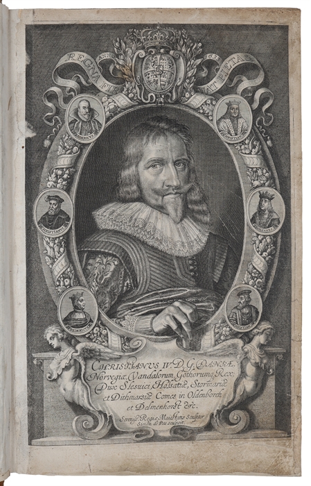 A nice copy of the scarce first edition of the last (i.e. the third) of the Danish folio-bibles, known as "Christian IV's Bible", being a slightly revised edition of the Bible of 1589 (Frederik II's Bible). Christian IV is the most famous Danish king ever to have lived, and the Christian IV bible is extremely sought-after. The numerous woodcut illustrations are the same that were used for the Frederik II's Bibel from 1589. The four engraved leaves - the portrait and the three title-pages - are by Simon de Pas. Despite already having two beautiful folio-bibles, Denmark's supply of Bibles was insufficient for the nation's needs. In many parishes only the church had a copy, with a few more in the homes of the wealthy. This shortage was particularly severe in Norway due to its distance from the capital, which limited the benefits of initiatives from the King. Funds were raised from churches in Zealand and Norway, with Norway contributing generously. Two printers, Melchior Martzan and Salomon Sartor, were employed, with Martzan overseeing corrections and sales. Norwegian churches' significant contributions were rewarded with copies equivalent to their donations, while Zealand's lesser contributions received no compensation. Biblioteca Danica I, 9.