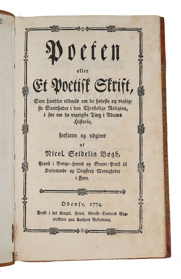 The rare first edition of Bøgh’s final publication. A few years before his death, he considered starting a weekly publication where religious teachings would be addressed in verse. He had written over a hundred sheets but lacked the money and time to publish it. Only a fragment, the present, was published. Niels Seidelin Bøgh (1717—1778) was a pastor born in Trige, Denmark. As a theological candidate, he published a large original collection of hymns titled "Den sjungende Theologus" in 1742. In 1743, Bøgh became a ship's chaplain and accompanied Danneskjold's squadron to Algiers in 1746. After his return, he wrote "Den algierske Freds Historie" (The History of the Algerian Peace) in verse. In 1747, he was appointed parish priest in Kerteminde, became district provost in 1761, and died on August 23, 1778. OCLC only list two copies, both in Copenhagen. Not in Biblioteca Danica.