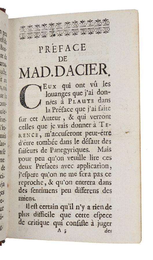 Rare later edition of Anne Le Fèvre Dacier’s translation Terence’s Commedies first published in 1683. The present edition was published the same year Dacier died and was edited by Martin Deschner.