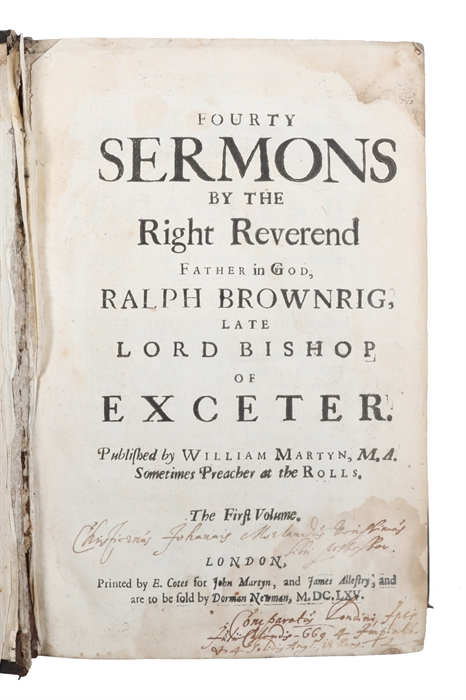 Folio (290 x 195 mm). In contemporary full sprinkled calf with five raised bands. Wear to extremities, upper and lower part of front hinge split. Corner bumped with loss of leather to upper corner of front board. Previous owner's name and annotation in contemporary hand to title-page. First leaves miscoloured and frontispiece detached. (22), 648, (10), 439 pp. + frontispiece.