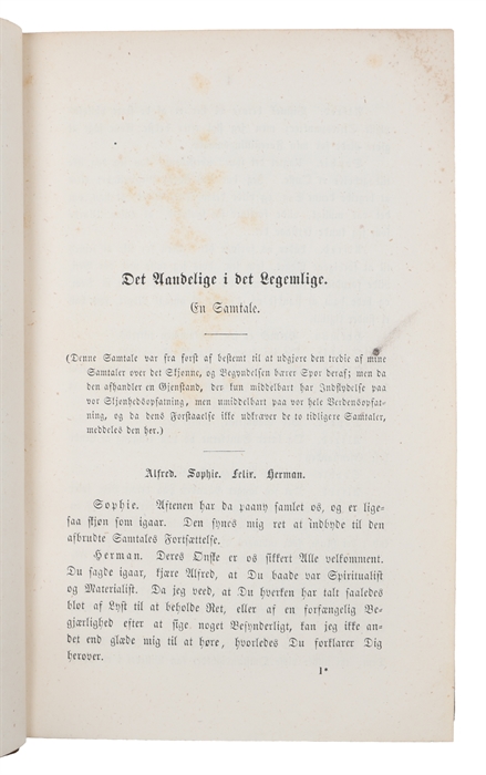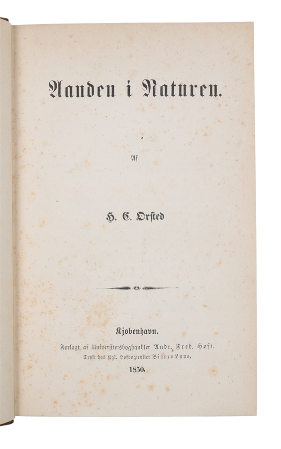 First edition of Oersted's main work on natural philosophy. Oersted is universally known for his discovery of Electro-Magnetism in 1820. Afterwards he went on to write a number of important philosophical works on natural philosophy and empiricism, of which he considered "Aanden i Naturen" as his main work. The work is found printed on 2 sorts of paper, common- and vellum paper, the present copy being on vellum. Both Hans Christian Andersen and Søren Kierkegaard admit to having been influenced by the writings of Oersted. "He was an enthusiastic follower of the "Naturphilosophie" school in Germany, whose main object was the unification of physical forces, thus producing a monistic theory of the universe. It was to further this purpose that Oersted sought in actual phenomena the electro-magnetic identity of which he had already convinced himself on metaphysical grounds" (Percy H. Muir in Printing and The Mind of Man). The copy once belonged to the renowned Danish book collector Gustav Philipsen (1853-1925) and carries his exlibris.
