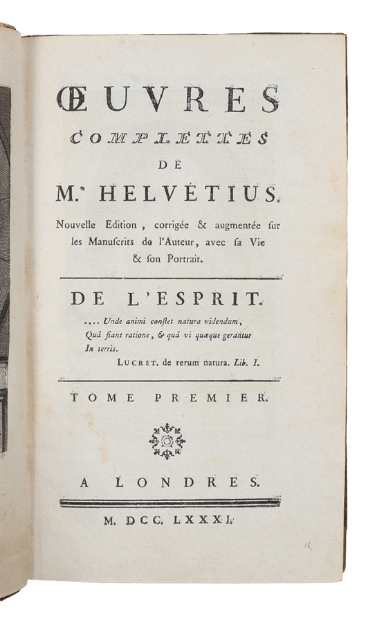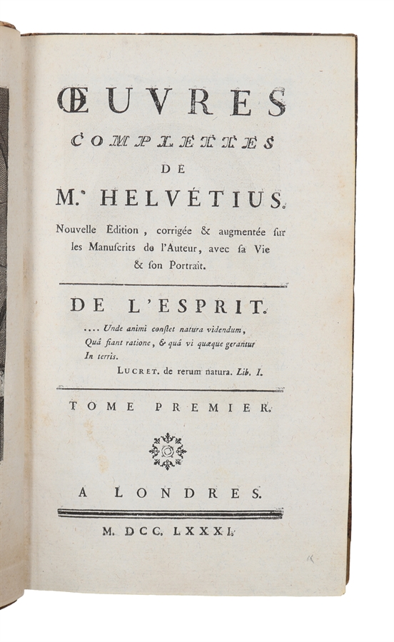 Uncommon clandestine edition of the works of Helvetius. "Cette edition clandestine de Bouillon au titre rouge et noir fut tirée a 2000 exemplaires sur papier de qualite. Est importante pour l'etude de Helvetius et est assez rare. Elle fut preparee a Paris par l'abbe Lefebvre de La Roche, heritier des textes du philosophe [.] Il existe une autre edition identique sur papier moyen et sans portrait". (Tchemerzine, VI, 200) (i.e. This clandestine edition from Bouillon, with a red and black title, was printed in 2,000 copies on quality paper. It is important for the study of Helvétius and is quite rare. It was prepared in Paris by Abbé Lefebvre de La Roche, heir to the philosopher's texts. There is another identical edition on medium-quality paper and without a portrait.). Tchemerzine, VI, 200.