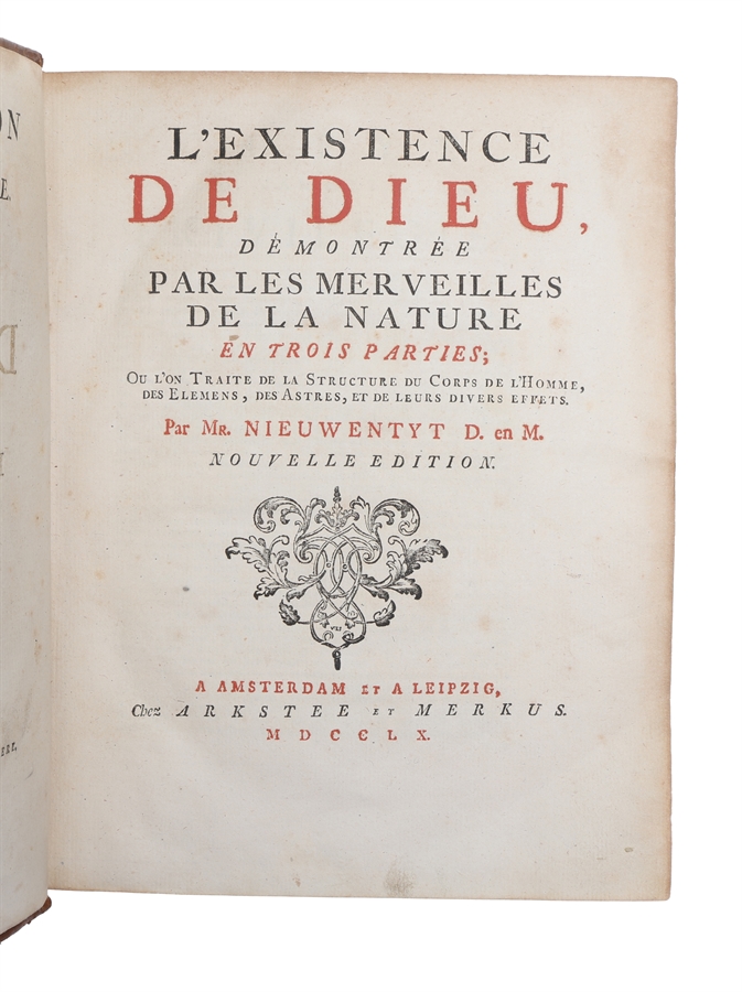 Uncommon later expanded edition of this treatise in which Nieuwentyt argue for nature as evidence for the existence of god.