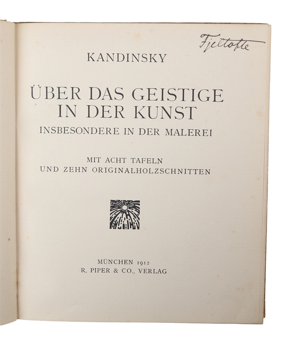 The scarce first edition, first printing of Kandinsky’s landmark theoretical work of art, ”A seminal text in the history of modern art” (Guggenheim), curiously bound in the third issue binding. The first issue is easily distinguishable from the second and third that also appeared in 1912, as they are both expanded and have 124 pp., whereas the first has 104. The present copy has small remains of stitching towards the inner margins, so perhaps someone had this first issue printing inserted into the third issue binding, which is sturdy as opposed to the wrappers of the first issue. “In Concerning the Spiritual in Art Wassily Kandinsky, one of the most famous abstract painters of all time, urges the reader to free themselves from art's traditional bonds to material reality. In this radical theoretical work, he calls for a spiritual revolution in painting, arguing that artists, much like musicians, should be allowed to express their own inner lives in abstract, non-material terms. Investigating form and colour, spirituality and tradition, Kandinsky explores art's resonance with the soul, its purpose and nature, and its power to inspire us, to stir our emotions and to help us see beyond the limits of our world. A significant contribution to the understanding of non-objectivism in art, this book serves as an important landmark in modern art history and is necessary reading for every artist and art-lover.” (From the Penguin Classics edition). “In this remarkable book, anticipating “the spiritual turning-point” Kandinsky reflects on his understanding of progress in this direction. This is not a process that would happen automatically. It requires a lot of work and implies a great responsibility of both artist and viewer. The task of the artist is to find “the principle of the innermost necessity” that he or she can use through expressive means to achieve the goal, “vibration of the human soul.”
