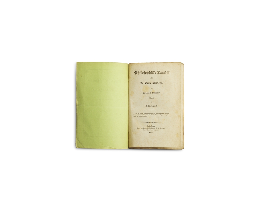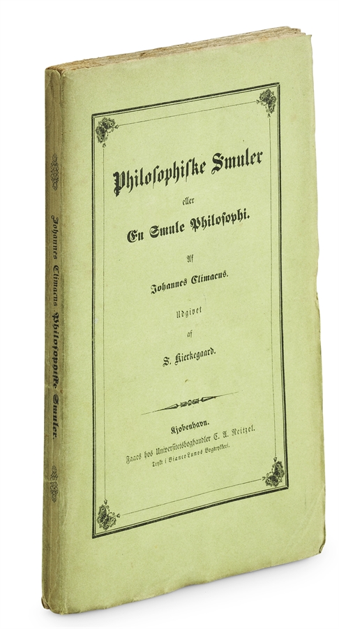 A truly remarkable copy of the first edition, in completely original condition, in the fragile original wrappers, virtually untouched. We have seen copies in the original wrappers before, but never in this state. This is a truly amazing survival. In uncut state, the work is a lot larger than regular copies – more than a cm taller and also significantly wider. By many, Philosophical Fragments is considered Kierkegaard’s actual religious-philosophical main work. It is the first book written under the important pseudonym Johannes Climacus, and it is here that Kierkegaard unfolds the tension between philosophy and religion in an attempt to find a historical onset for eternal consciousness, opposing the ideological thought inherited by Plato, Aristotle and Hegel. Through Climacus, Kierkegaard contrasts the paradoxes of Christianity with Greek and modern philosophical thinking. He begins with Greek Platonic philosophy, exploring the implications of venturing beyond the Socratic understanding of truth acquired through recollection to the Christian experience of acquiring truth through grace. It is in Philosophical Fragments that Kierkegaard’s polemic against the philosophy of Hegel becomes most obvious, portraying clearly for the first time how the salvation of man can only be found through the paradoxical inversion of the rational values of speculative philosophy and through the “leap of faith” in the crucified Christ. It is here that we have the very root of Existentialism. In his preface, Kierkegaard hints at a possible “sequel [to Philosophical Fragments] in 17 pieces”; this sequel was published in 1846, namely as the 600 pages long Concluding Unscientific Postscript to the Philosophical Fragments (which is 83 pages long…). Only one single presentation-copy of Philosophical Fragments is known to exist. Himmelstrup: 62. The present copy is no. 23 in Girsel's "Kierkegaard" (The Catalogue) which can be found here.