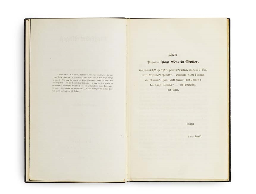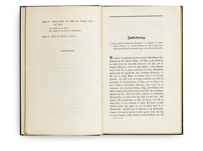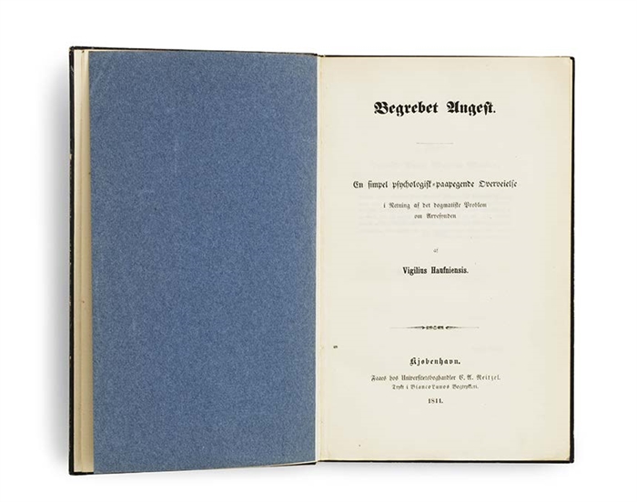 A unique copy of the scarce first edition of this classic of Existentialism, being the only known copy printed on fine paper. The Concept of Anxiety is one of Kierkgaard's greatest works, his primary psychological work, and the work with which "Angst" is introduced in philosophy. It is futhermore (together with Sixteen Unbuilding Discourses - the amputated Eighteen Upbuilding Discourses), the rarest of Kierkegaard's works, at is was printed in half as many copies as his other works.  Not a single presentation-copy of the work is known to exist, no copy on special paper has been registered (before this), and merely a single copy of the work is listed in the auction catalogue of Kierkegaard’s books sold after he died (the whereabouts of this copy unknown). This could possibly be the hitherto unlocated copy from Kierkegaard’s own collection. Or it could be a copy he gave away, the only one to have ever surfaced. It is undoubtedly one or the other, seeing that it is on special vellumpaper, on which Kierkegard only had copies made for himself, for presentation, or for Regine. It is this classic of Existentialism that introduced the notion of “Angst” (anxiety) in philosophy. If Kierkegaard had written nothing else, The Concept of Anxiety alone would have cemented him as one of the most important thinkers since antiquity. Nowhere else can one find an account of the concept of anxiety that comes close in importance to the one Kierkegaard gives in the present work. Using the Fall in the Garden of Eden as the foundation of the analysis, he succeeds in describing what no-one has been able to before or since. “Long before modern psychology had entered puberty, Kierkegaard unfurled advanced psychological concepts that in many senses were Freudian before Freud was around. In his primary psychological work, The Concept of Anxiety, he presents his detailed analyses of the relationship of anxiety to phenomena such as freedom, sexuality, original sin, and history.” (The Søren Kierkegaard Research Centre). Being one of his most important and influential philosophical works, The Concept of Anxiety is essential to all later existentialist writers. It was arguably this work that more than any other influenced Existentialism. The work bears a printed dedication to his beloved Poul Martin Møller, one of the most beautiful and moving dedications in a philosophical work. Poul Martin Møller was his philosophy professor, but more than that he was a moral mentor and one of a few people that Kierkegaard truly admired and cared for. Poul Martin Møller died in 1838, leaving almost no published works behind; he is the only person outside of Kierkegaard’s immediate family (here including Regine), who had been honoured with a printed dedication in any of his books. Apart from the title Sixteen Upbuilding Discourses (the amputated Eighteen Upbuilding Discourses – without the two that were quickly sold out), The Concept of Anxiety is by far the scarcest of Kierkegaard’s works – “The Concept of Anxiety was only printed in 250 copies!” (Textspejle, p. 58, translated from Danish), which is ca half of most of the other works. It is, interestingly, the only one of the pseudonymous writings from the period that was reprinted, despite the poor sales numbers of the first issue. In the summer of 1847, when Reitzel buys the remainders of the first issue, a mere 165 copies of what is arguably now considered Kierkegaard’s most important work had been sold. The Concept of Anxiety is not only notorious for its pivotal importance in the history of philosophy and for essentially being the theoretical foundation of Existentialism; among Kierkegaard collectors and bibliophiles in general, it is also notorious for its scarcity, having been printed in a mere ca 250 copies. Furthermore, like Fear and Trembling, not a single presentation-copy of the work is known to exist, nor had any copy printed on special paper ever been discovered (until now). A single copy of the work is listed in the auction catalogue of Kierkegaard’s books sold after he died. But the whereabouts of this copy is unknown (possibly until now). Himmelstrup 62. The present copy is no. 24a in Girsel's "Kierkegaard" (The Catalogue) which can be found here.