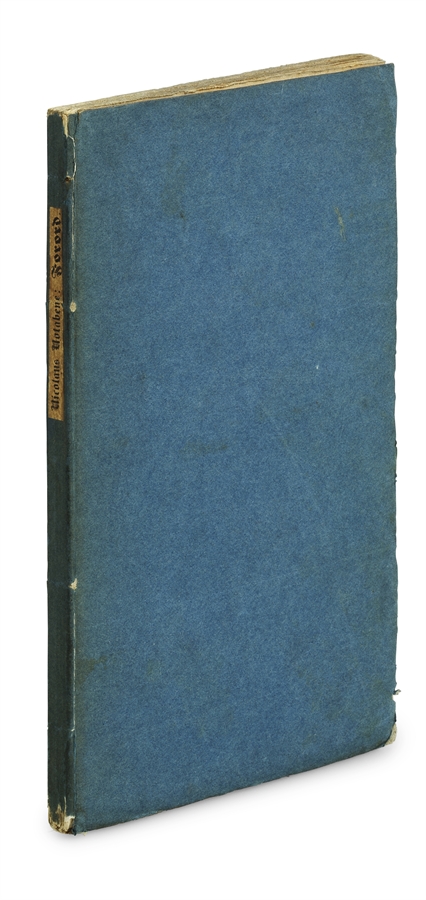 First edition of Kierkegaard's most humorous book, Prefaces, in the very rare original blue binding in truly magnificent state and with the printed title-label preserved in its entirety. Published simultaneously with The Concept of Anxiety, Prefaces can be viewed as its companion piece. It represents an altogether different genre and is the most humorous of all of Kierkegaard’s works, but the two fictional authors of the works interestingly contrast each other. Although having been eclipsed by the now notoriously famous Concept of Anxiety, Prefaces was in fact more popular when it appeared and sold many more copies. Written under the pseudonym of Nicolaus Notabene, the “author” name indicates that despite its humorous approach, Prefaces is still something serious – something to be noted. And it certainly is. It is here that we find Kierkegaard’s sarcastic roasting of the Hegelian system and of the Danish Hegelians with Johan Ludvig Heiberg as the main representant. Through Notabene, he makes fun of Heiberg and Hegel, who both want to explain everything and want to be mediators of understanding. Just as Hafniensis in The Concept on Anxiety poses that “how sin came into the world each man understands solely by himself. If he would learn it from another, he would misunderstand it” (p. 51), so Notabene in Prefaces states that “My frame, my health, my entire constitution do not lend themselves to mediation” (p. 45). In Prefaces we also find Kierkegaard’s thoughts about the relationship between the reading public and the author and his fierce criticism of literary critics and reviewers, among these also Heiberg as well as Martensen, who famously reviewed Either-Or and Repetition respectively. And in the very amusing preface to the Prefaces, we are given another glimpse into Kierkegaard’s thoughts on marriage and the dilemma he found himself in with Regine – the inner struggle between he, who is the husband, and he, who is the author; can one be both? With its challenging notions on the idea of the book and the interaction of the book with its readers, his little ironic masterpiece is a clear forerunner of Postmodernism. “Kierkegaard’s ‘Prefaces’ is a brief though not unimportant work. Themes he develops elsewhere at greater length here are presented with characteristic insight and wit. This richly suggestive text has never received the attention it deserves. William McDonald’s fine translation now makes it possible to assess the importance of ‘Prefaces’ for Kierkegaard’s œuvre and to appreciate its significance for philosophical, literary, and theological issues that are still with us.” (From the review of William McDonald’s 1989 edition of Prefaces in English in the Kierkegaard and Postmodernism-series). Written under a pseudonym and without Kierkegaard’s name appearing as publisher or indeed as anything else, he was unable to give away presentation-copies of the work (due to his own strict set of rules for this). Thus, not a single presentation copy of the work exists. A single copy of the book was in the auction catalogue of his book collection after his death. Himmelstrup 70. The present copy is no. 28 in Girsel's "Kierkegaard" (The Catalogue) which can be found here.