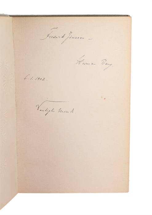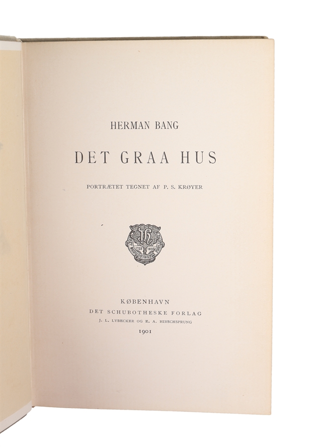 8vo. I det originale komponerede helbind af gråt rusking. Forgyldt titel på ryg og forperm. Helt guldsnit. Ryg falmet og med en smule slid. Med egenhændig dedikation fra Bang på fribladet: "Frederik Jönsson - / Herman Bang. / 6.1.1902. / Venligt Minde." Ren og pæn indvendig. Med frontispieceportæt, udført af Krøyer, af Bang.