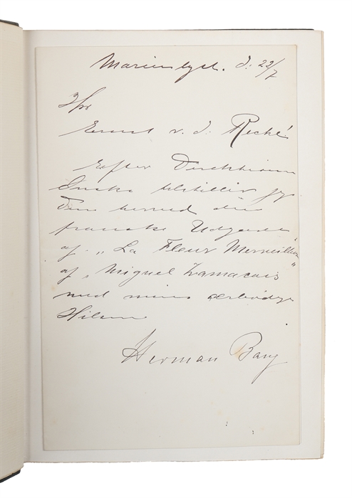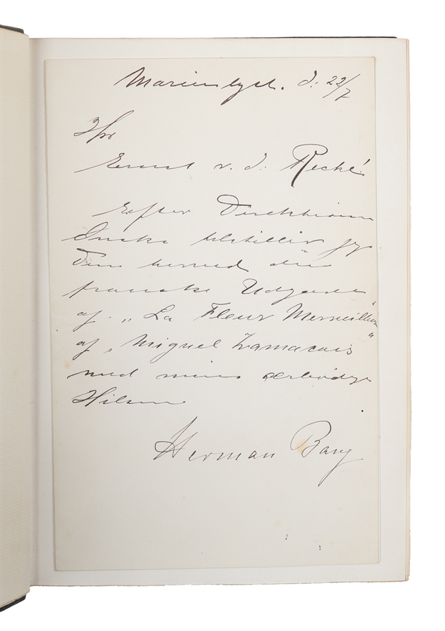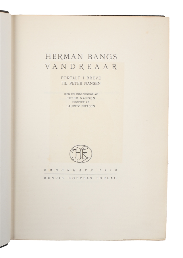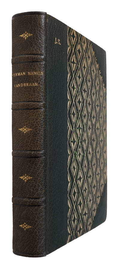 Lex. 8vo. Indbundet ubeskåret med de originale omslag i et smukt lidt senere halvmaroquinbind med enkel rygforgyldning. Fire ophøjede bind på ryg. Ryg en smule falmet. Topguldsnit. Forgyldt superexlibris ("J.S.") på forperm. Med et originalt håndskrevet brev fra Bang til den danske forfatter Ernst von der Recke indklæbet på fribladet. Særdeles rent eksemplar.