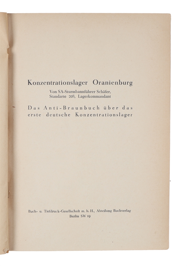 First edition, first printing of this scarce account of the first German concentration camp, a whitewashing apologetic “Anti-Brown-Book”, in which the camp commander attempts to disprove allegations against the camp as “atrocious propaganda”. “The Oranienburg concentration camp was established as one of the first concentration camps on March 21, 1933, overshadowed by the Day of Potsdam. After the “Night of the Long Knives,” the SA-run camp was taken over by the SS in July 1934 and dissolved a little later… Initially SA-Regiment 208 (Standarte 208) established the Oranienburg concentration camp without notifying the responsible authorities in Berlin beforehand. The first inmates were 40 prisoners who were dragged to the small town 20 kilometers (12.4 miles) north of Berlin on the evening of March 21, 1933. The first concentration camp in Prussia was thus situated on the grounds of a former brewery on a main road in Oranienburg. From September 1933, subcamps existed at the Elisenau manor in Blumberg near Bernau and in Börnicke. (https://encyclopedia.ushmm.org/content/en/article/oranienburg-1) “Seger managed to escape in December 1933, fleeing first to Czechoslovakia and later to the United States of America. His book on the terror in Oranienburg was one of the first books written about the conditions in a concentration camp from firsthand experience.” (Holocaust Encyclopaedia) “Only a few days after the establishment of the camp, SA Standartenführer Werner Schulze-Wechsungen transferred control of the camp to the Potsdam district president. Henceforth the camp as well as the guards were paid from tax money. In total, the German tax payer paid 280,000 Reichsmark (RM) between August 1933 and July 1934 to sustain the camp. Internment in the camp was initiated not only by the police and party authorities but also by local administrative authorities. Only because of its location in the town, the camp proved to be a “transparent concentration camp.” The town of Oranienburg had the political prisoners perform communal work. The camp commander, SA-Sturmbannführer Werner Schäfer, compiled an apologetic “Anti-Brown Book” (Anti-Braunbuch), in which he characterized allegations about the Oranienburg concentration camp as “atrocious propaganda.” Repeatedly he invited German and foreign journalists to tour the camp. A radio program “reported” from the concentration camp. The local press wrote extensively about the new institution. Also, movie theaters showed propagandistic About 3,000 prisoners were deprived of their liberty in the Oranienburg concentration camp. The number of prisoners varied considerably. It rose rapidly until August 1933, from 97 to 911, but declined by the end of June 1934 to 271. The prisoners were mostly between the ages of 20 and 40, laborers, unemployed, from Berlin and from the area north of Berlin. Many were taken to Oranienburg after the dissolution of smaller Brandenburg concentration camps (including Alt Daber, Börnicke, Havelberg, and Perleberg) in June and July 1933. Prisoners from the concentration camps in Börgermoor, Lichtenburg, and Sonnenburg were interned at Oranienburg in September and October. Most of the inmates were members of the German Communist Party (KPD), the Social Democratic Party (SPD), and smaller left-wing organizations such as the Socialist Workers’ Party (SAP) and the German Communist Party Opposition (KPO). It is noteworthy that about 50 Jewish youths were also carried off to the camp from a home dedicated to advanced pedagogical ideas that was operated by the German Jewish Community Association (Deutsch-israelitischer Gemeindebund) in Wolzig. They had been abducted because of “Communist activities”.” (Holocaust Encyclopaedia)