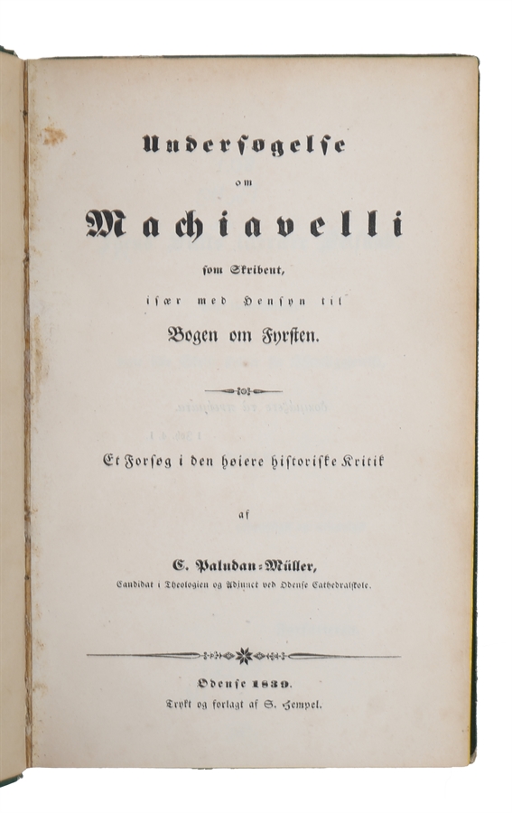 First edition of the first real contribution to Machiavelli literature in Denmark, defining the way that Machiavelli was viewed in Scandinavia. The author Caspar Pauldan-Müller (1805-1882) was one of the most important Danish historians of his time and brother of the famous Danish poet Frederik Paludan-Müller. "The explicit revaluation of "The Prince" in Scandinavia had already taken place during the Romantic Age, thanks to the Danish historian Caspar Peter Paludan-Müller (1805-1882), and particularly to his essay "Undersögelse om Machiavelli som Skribent, især med Hensyn til Bogen om Fyrsten. Et Forsøg i den høiere historiske Kritik". The first Danish translation of the whole work dates back to only 1876." (Roberto de Pol: The First Translations of Machiavelli's Prince, p. 249). The work is still of the utmost importance, not only because of Paludan Müller’s own, original interpretation of “The Prince” and Machiavelli's historical importnace, but also because Paludan-Müller here considers a very large number of publications written about Machiavelli throughout the three preceding centuries, contributing significantly the reception history of both Machiavelli and The Prince. As the historian Erslev later noted in his overview of Danish literature, this work would presumably also internationally have been considered a very important contribution to Machiavelli literature, had it been published in a more widely read language than Danish. The work was recently (2020) republished (in a modernized Danish), for the first time since its original appearance in 1839.