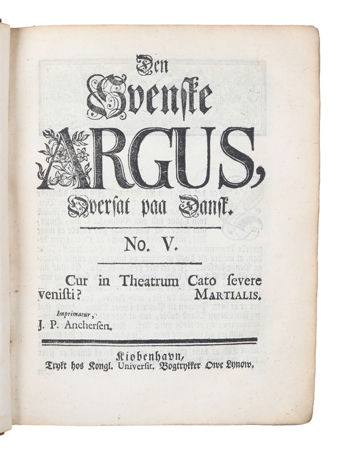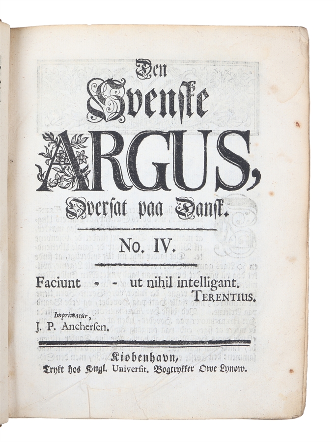 The rare first Danish translation of the very popular "Then swänska Argus" (1732–34), modeled on Joseph Addison’s Tatler and Spectator. This periodical helped introduce the ideas of the Enlightenment into Sweden, but its language and literary style were of even greater importance; it is regarded as ushering in the age of modern Swedish prose. This present Danish translation exerted some influence both on Riis’s Danske Spectator and on Holberg, who mentions it in the preface to Moralske Tanker.